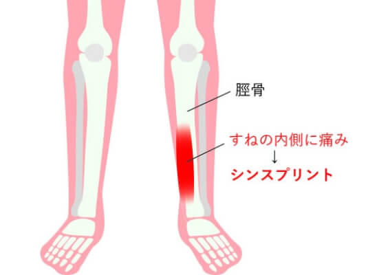 シンスプリントでは、スネの内側に沿って痛みが出ます。